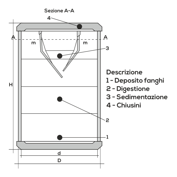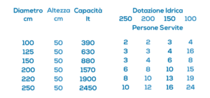 I dati delle persone servite nelle due tabelle si basano su un periodo di 24H di permanenza e, per dotazione idrica, si intende la quantità di liquame che ogni persona produce in questo lasso di tempo. Prendiamo il caso normale di 150 litri per persona al giorno, l’impianto più piccolo dal diametro di 1000mm con l’altezza di 2300mm sedimenta e purifica la quantità di liquame di 9 persone. Riducendo la permanenza secondo la qualifica dei liquami da una parte e secondo le esigenze delle Autorità Sanitarie dall’altra, per esempio a 12 ore, il numero delle persone servite si raddoppia, rimanendo al nostro esempio, in questo caso, a 18 unità. La cifra delle persone servite si orienta, dunque, alla necessità di permanenza richiesta. Il tempo di permanenza è dunque in proporzione alle persone servite ed alla qualità del liquame.